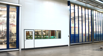 Abtrennung einer Produktionsfläche bis zum Hallendach mit übergrossen Schnelllauf-Rolltoren. Wandhöhe 7 m.